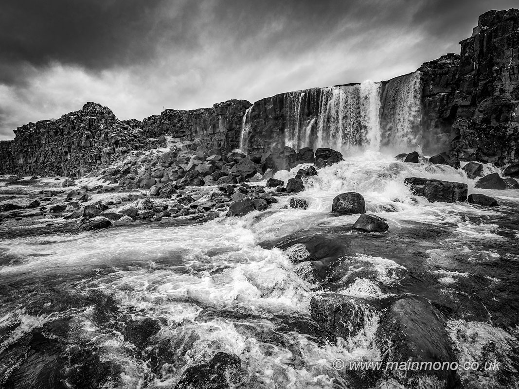 Oxararfoss Waterfall at Thingvellir, Iceland, one of the major attractions on the Golden Circle tourist route.